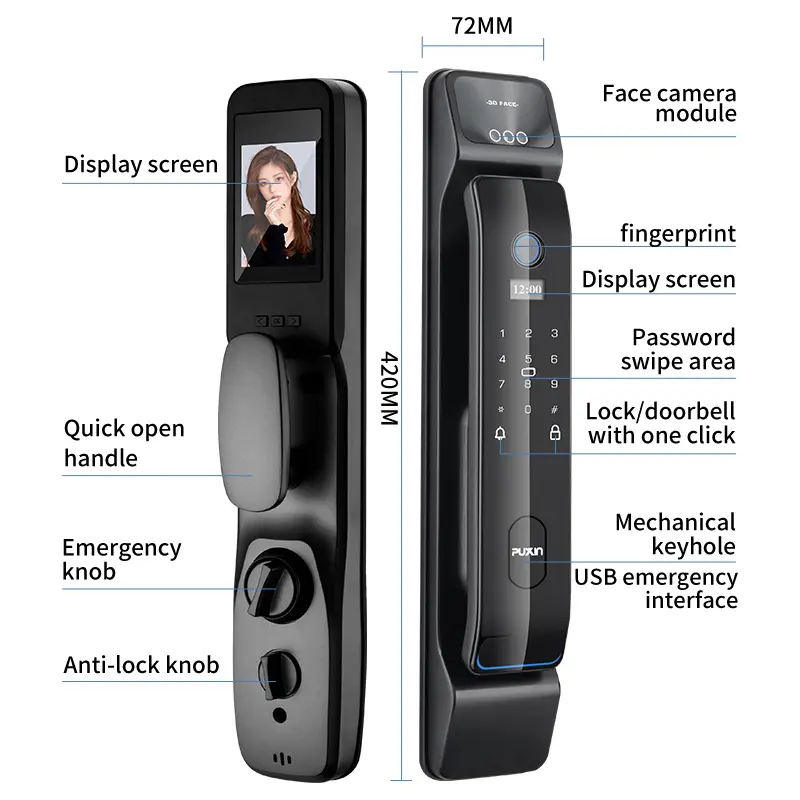 Како професионален производител и снабдувач на интелигентни брави со корени во Кина, PuXin има богато искуство во индустријата за интелигентни брави за врати, со поволни ценовни предности и покриеност на повеќето европски и американски пазари. PuXin DF65 3D Face Smart Lock, суштински биометриски производ, се одликува со високопрецизен бинокуларен инфрацрвен алгоритам за препознавање лице и висококвалитетна обработка на површината, обезбедувајќи ефикасно отклучување, издржливост и антистатички перформанси.